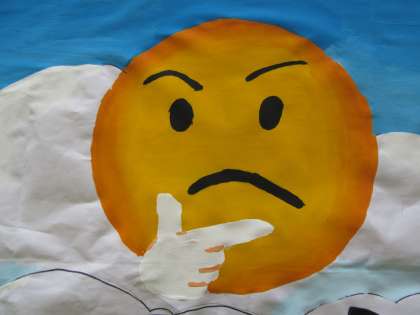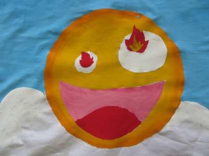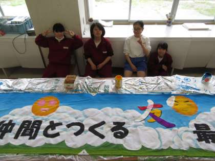 高原教室のスローガン作成を依頼された創作部2年生。張り切って作成し、素晴らしいスローガン旗ができました。出発式でお披露目です。