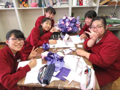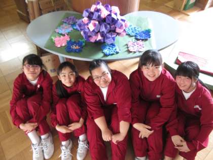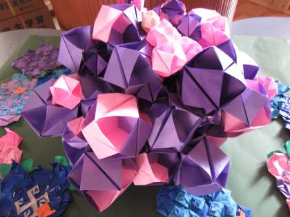 創作部の1年生が集中して作品を作り上げました。次々と立体を折っていき、大きな立体と小さな立体をあじさいの花のように上手に組み合わせました。チームワーク良く、集中して制作しました。