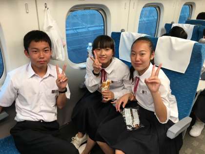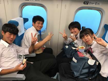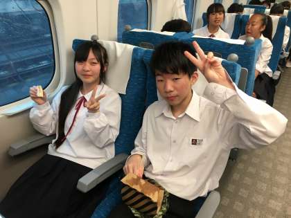 静岡駅を通過し、朝食の時間です。お家の方が作ってくださったおにぎりやお弁当を、美味しそうに食べてます。