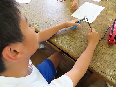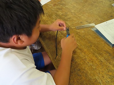 2D技術:導線とスイッチをつなげる方法を学習しています。ニッパを上手く使うためにはどうしたらよいか、試行錯誤しながら活動していました。