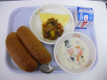・黒糖ロールパン・牛乳・クリームシチュー・オムレツ・ラタトゥイユ