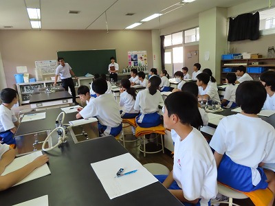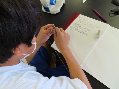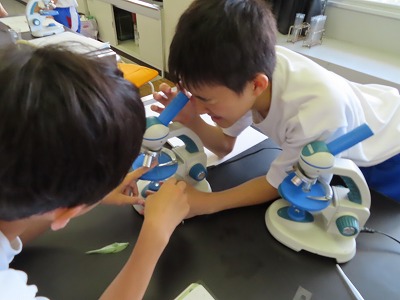 1A理科:ムラサキツユクサの葉の裏の観察を行っています。気体の出入りはどこで行われているのでしょうか。一生懸命探していました。