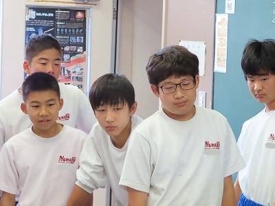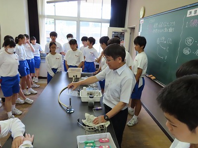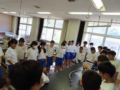 2C理科:有機物はどんな物質でできているか、実験で確認しようてしています。はじめに演示実験を行い、実験の確認をしてから、実際に実験をおこなっていました。ビーカーを炎にかざすと、どんな変化がみられたでしょうか。