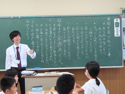 1B道徳:「席替え」という教材を用い、「公正・公平」について考えていきました。ははじめに、挿絵からわかることを考えていました。