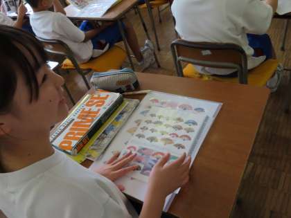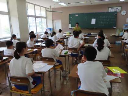 2C美術:「扇子づくり」のための説明を聞いていました。どんな扇子ができるか楽しみです。