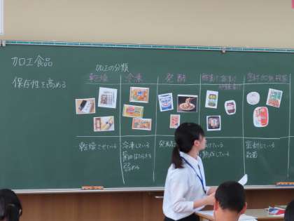 2D家庭科:教育実習生の授業です。加工食品の種類を調べ、分類していました。