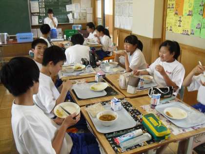 五目ラーメンのスープは、煮干し、削り節、にんにく、生姜、ねぎを使ってだしを取っています。おいしそうに食べていました。写真は1年A組です。