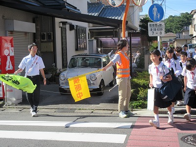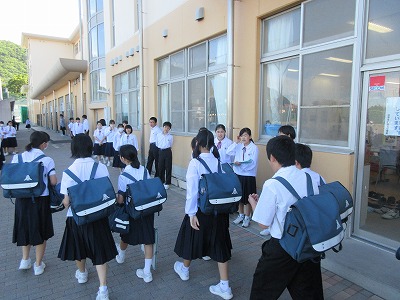 朝、生徒は元気よく登校しています。生徒は各クラスごとボランティアを募ってあいさつを行っています。先生たちは、たすきを掛けてあいさつ運動を行っています。