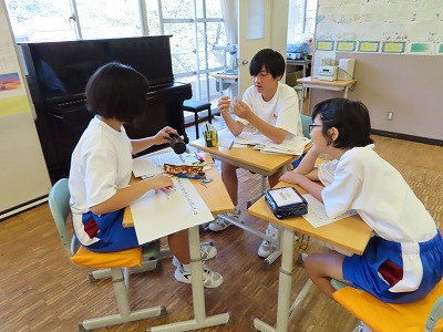 1A音楽:「浜辺の歌」のフォルテのところでは、どんな思いでを懐かしく思っているか考えています。グループで、ホワイトボードを活用して授業が進んでいました。