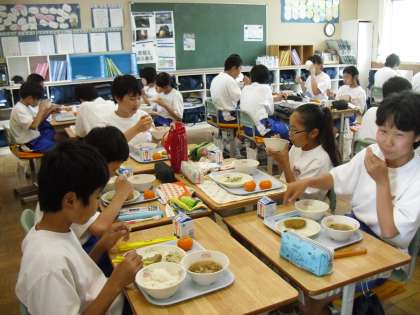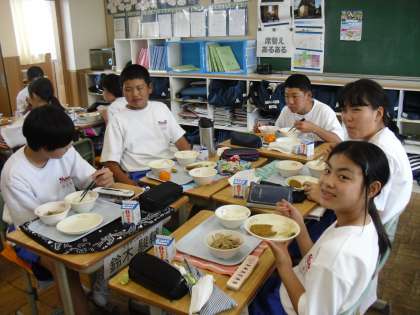 静岡のお茶の衣がついた黒はんぺんや、西浦の寿太郎みかんで作られた冷凍みかんで地元の味をいただきました。写真は1年C組です。