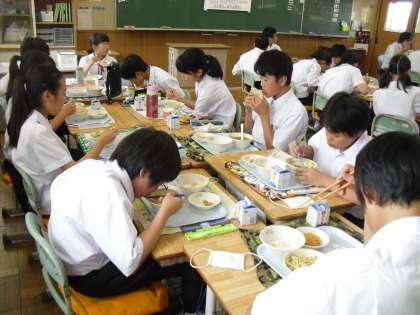 カレーソースで制服を汚さないように気をつけながら食べていました。写真は1年D組です。