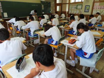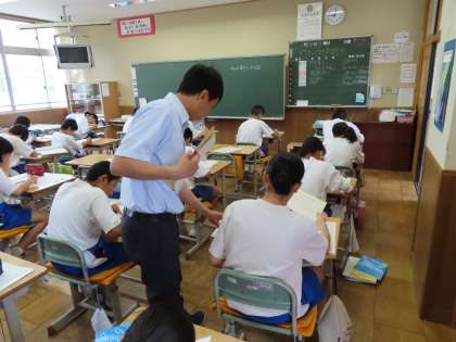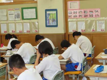 2B数学:テスト返しを行っています。満点解答を参考にして、自分の間違えを確認していました。