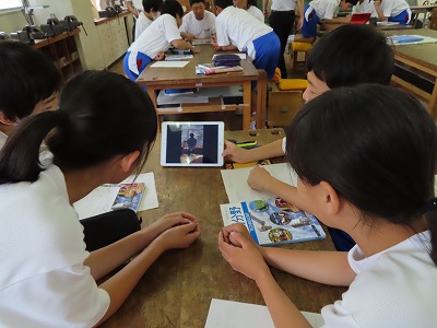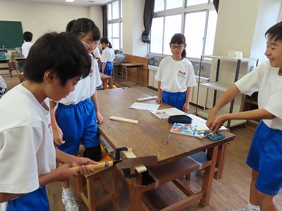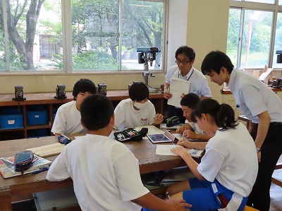 1C技術において、教職員研修センターの竹内研修アドバイザーをお招きして、研究授業を実施しました。木材加工(切断)を教材として、iPAD等のICTも活用した授業を行いました。生徒は、目的をもち、お互いに声を掛け合いながらまっすぐきれいに切断できるように活動していきました。最後に切片を下にして、木材が立ったときには、喜びの声が聞こえてきました。