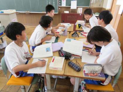 2D国語:段落相互の関係に着目し、筆者が伝えたいことをグループになり自分の考えを出し合っていました。