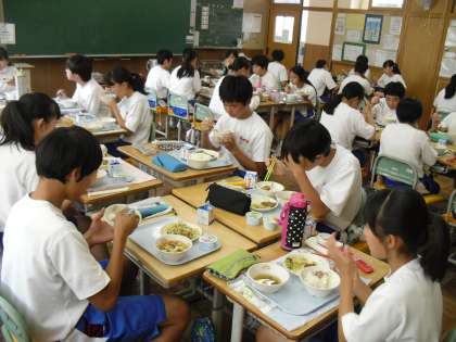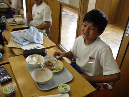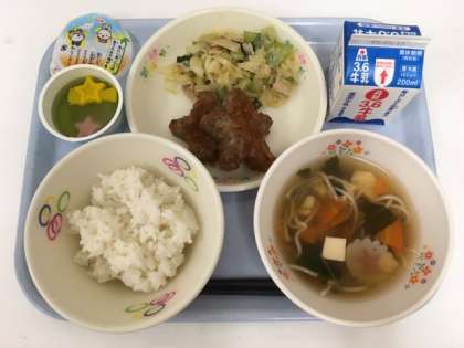 少し早いですが、星いっぱいの七夕献立でした。星形のハンバーグが人気でした!写真は楽しそうに食べていた2年C組です。
