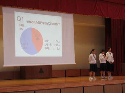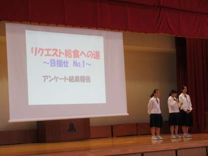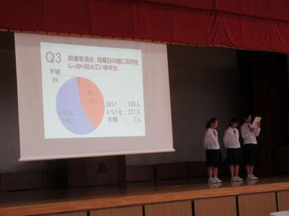 本日朝、生徒集会がありました。給食委員会からは現在特別活動としてリクエスト給食を行っています。リクエスト給食の目的は「残量がなくなってほしい」「落ち着いた状況で給食の準備をしてほしい」という目的があります。確実に成果が出ているようです。現在学校1位は55Pの1Cと3Eで、2位は54Pの2Aです。最後まで諦めずに頑張ってください。