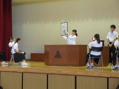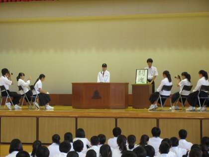 生徒会本部は9日朝、令和元年度の潮風祭スローガンを「闘魂」と決定しました。生徒会長が生徒集会で発表しました。新スローガンは全校生徒の投票から、生徒会が集計し、生徒会協議の上、決定したものです。このスローガン「闘魂」には、三中生の一人一人が力強い魂を持って、共に闘おうという思いが込められています。生徒会長から、これまでになく燃え上がり、盛り上がる、最高の潮風祭を目指し、全校で一丸となって作り上げていきたいという熱いメッセージがありました。