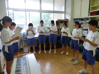 2年D組音楽は、合唱練習をしています。テノール、アルト、ソプラノと分かれて練習です。いい声が出ています。