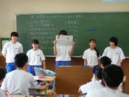 3年B組言語読解では、沼津市の人口を止める手立てをグループで考え、発表しています。
