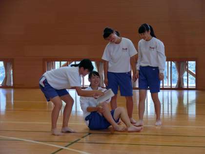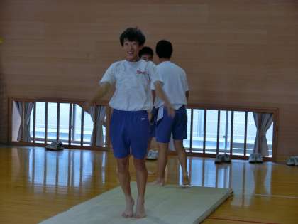 3年C組保体は、マット運動を練習しています。技がきまりいい笑顔です。友達の技を、アイパッドで撮影し、技の善し悪しを確認しています。