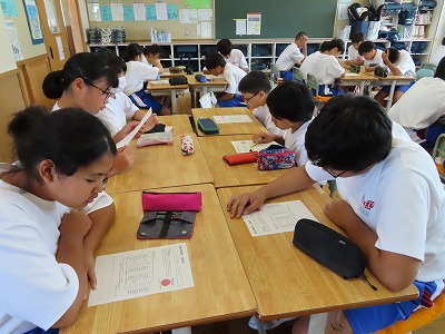 1E社会:ジグソー学習法という授業形態で行っています。この学習法は、全員が授業に参加するという必然性があるため、授業に活気がでます。みんな自分の考えをしっかりともつために、真剣に行っていました。