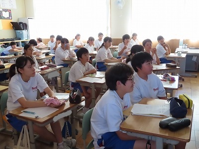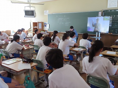 2C国語:ビブリオバトルのビデオをみて、実際に行うイメージをつかんでいます。みんな真剣にみています。