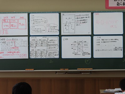 3E社会:ホワイトボードに、グループの考えをまとめて、そこから発展させて授業が進んでいました。様々な考えが出てきて、それぞれの考えに感心して、お互いを認め合っていました。