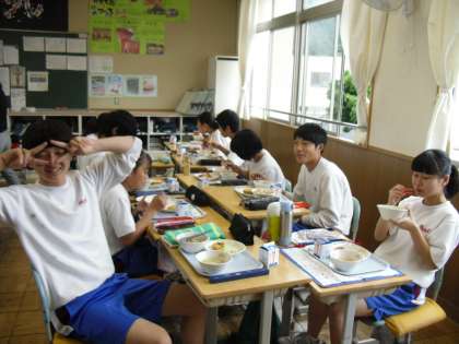 「冬瓜」という名前に興味をもって食べてくれる生徒もいました。旬の食材を味わいましょう。写真は3年B組です。