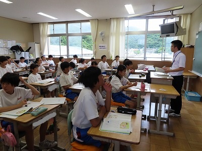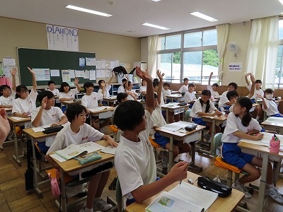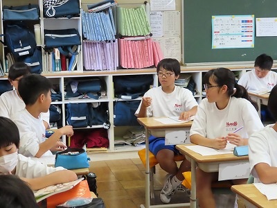 1年道徳:ボランティアをしたことがある生徒を聞いてみると、ほとんどの生徒が経験があると答えていました。その時の気持ちなどを話し合いました。