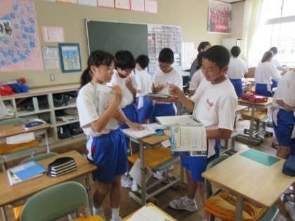2B英語:発展課題として既習した内容をもとに、状況にあう新しい対話をつくり、ペアで発表していました。ALTのクリス先生にも積極的に対話していました。