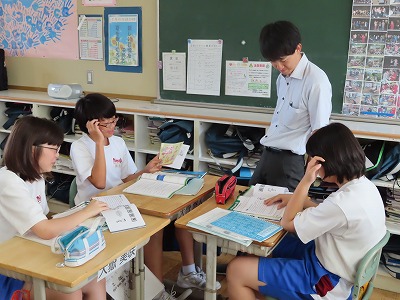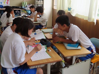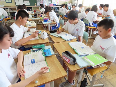 2B英語:会話の台本をつくる準備をしています。グループでお互いに協力して作成していました。