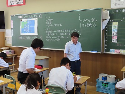 2B理科:授業のはじめに、台風について考えていました。現在発生している台風19号をもとにしています。その時に合った教材を適宜取り出して学習することにより、生活に密着していきます。