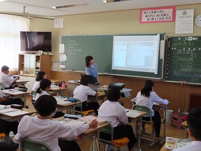 1D社会:平城京の地図から、それぞれの場所はどんなことが行われていたのか考えています。大きなスクリーンに映し出されているため、とてもわかりやすいです。