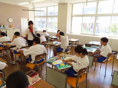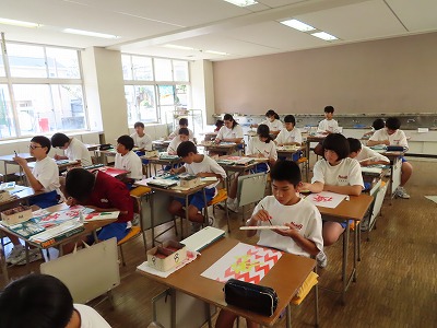1E美術:自分の名前を絵に表しています。名前の由来を、漢字の中にひらがなまたはカタカナで描いています。それぞれの工夫が見られ、完成品を見るのがとても楽しみです。