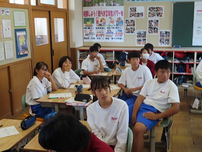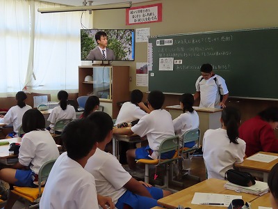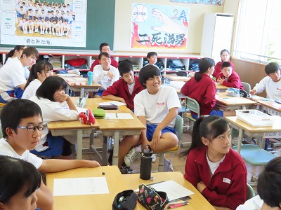 2A道徳:「だれを先に乗せる?」という資料を用いて、思いやり、感謝について考えました。はじめに、動画を見ながら、主人公(乗せる人)だったら誰を先に乗せるのかを考えていきました。