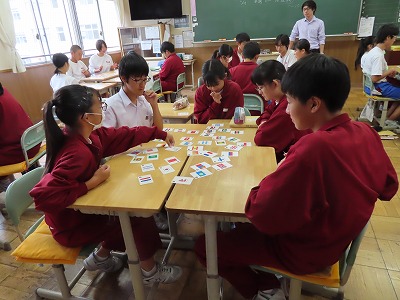 3A社会:国あてカルタを行っています。それぞれの国の特徴から、その国を表す国旗を見つけています。たくさん札をとろうと必死になっていました。