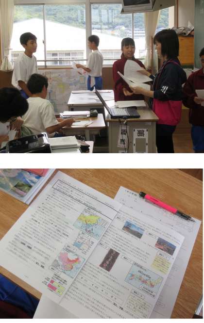 1A社会:中間テストの返却です。思考は緑、資料は青、知識は赤で○をもらっていました。みんなドキドキ、わくわくです。テスト問題もカラー刷りを活かし大変分かりやすく作成しています。