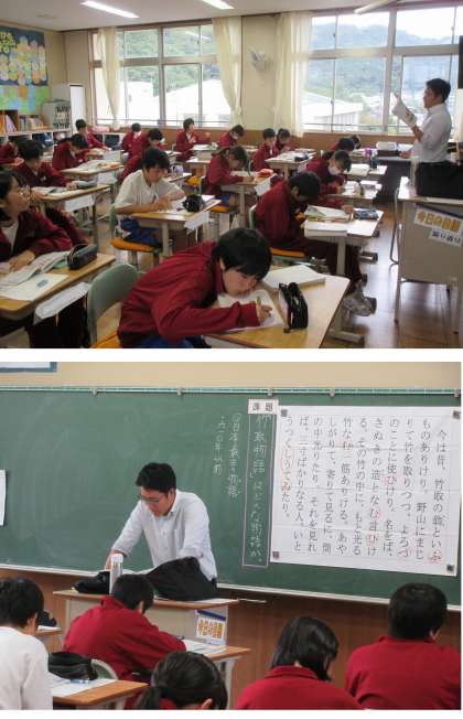 1C国語:「竹取物語はどんな物語か」物語とフィクションを比較し、物語の面白さを伝えていました。