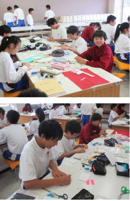 1D家庭科:ウォールポケット作りです。家庭科の授業では、いつもとまた違う表情が印象的でした。みんな細かな作業に真剣です。
