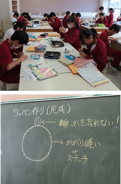 3B家庭:ワッペンづくりを行っています。黒板に大きく注意事項がかいてあり、生徒は意識しながら作成していました。