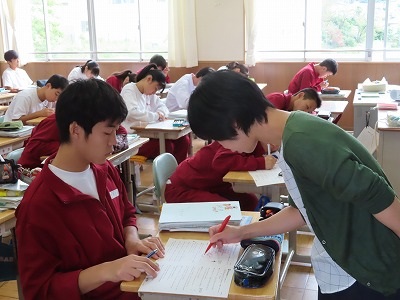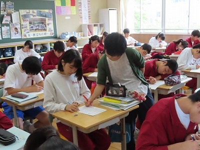 3C英語:演習問題を行っています。先生は、一人一人理解できているかどうか確認しながらまわっています。英語の歌のBGBも静かに流れていて、落ち着いた中で学習を行っています。