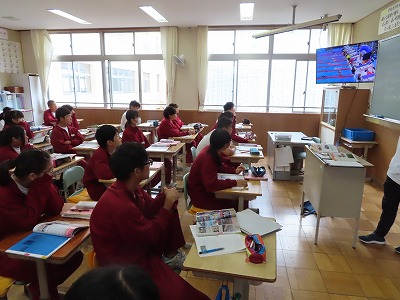 3D体育:「人々を結びつけるスポーツ」として、パラリンピックを取り上げ、どんな工夫がされているかを考えています。視覚や聴覚などの障害別にいろいろな工夫されていて、それぞれのルールに則って行われていることを理解し、そのスポーツの良さを実感していました。