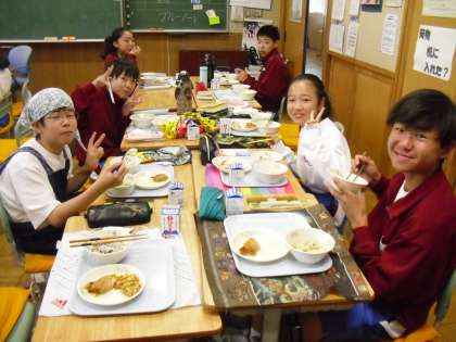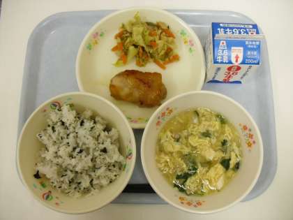 わかめご飯、鶏肉のみそ焼き、人気があります。おいしそうに食べていました。真は1年D組です。