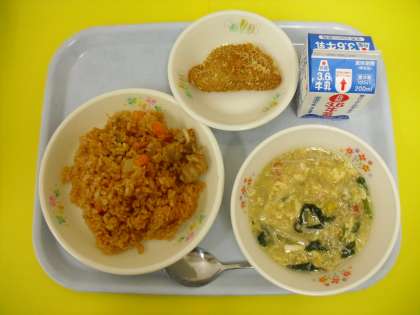 ・チキンライス・牛乳・ボロニアカツ・卵とコーンのスープ