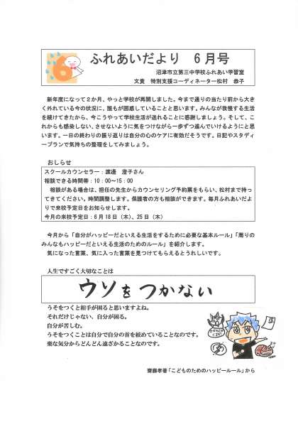 ふれあい学習室からのお知らせです。スクールカウンセラーさんの来校する日程が記入してありますので、御確認ください。
