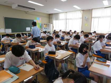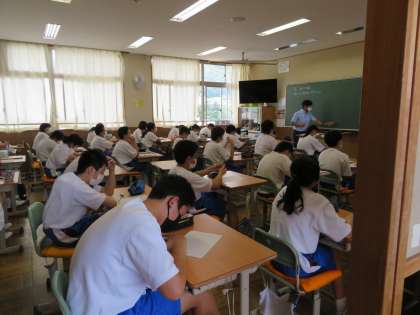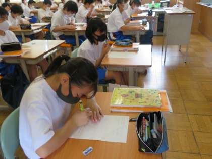 式の計算についての学習です。確認のプリントを解いていますが、よく理解できているようです。数学は間違えた問題が大切です。できなかった問題は必ず解き直しておきましょう。