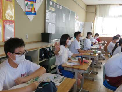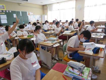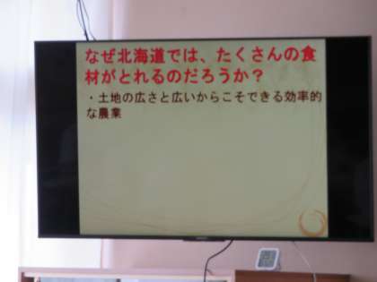 なぜ、北海道地方はたくさんの食材がとれるのだろうか。学習問題を提示して、みんな思考しています。北海道へ行ったことある生徒もいました。広大なスケールで北海道は良いですね。