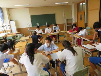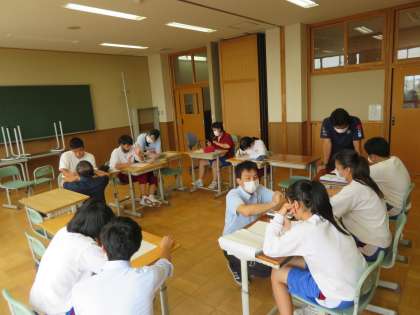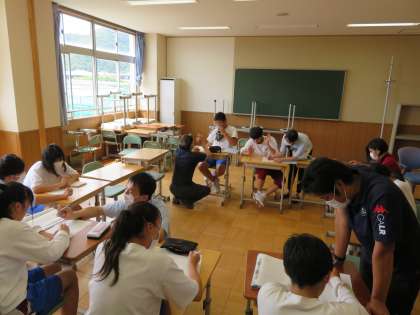 3年生の多目的室です。数学の補習を実施しています。短い時間ですが、多数の先生方で3年生を応援しています。生徒もわからない問題を積極的に質問してくれます。頑張っています。