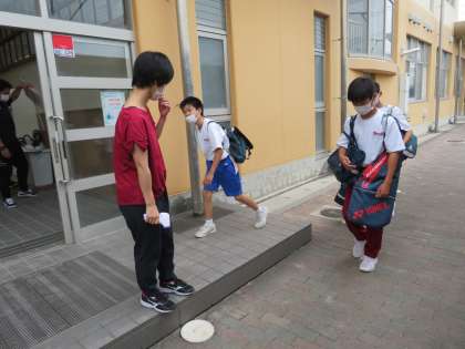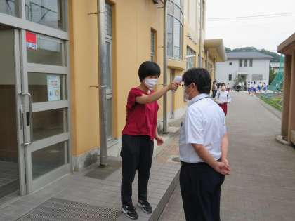 ○先生方は、生徒玄関で検温を忘れた生徒に非接触型体温計で検温しています。各学年数名の生徒が検温を忘れてきています。確実に家庭で検温をよろしくお願いします。
