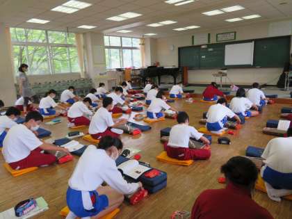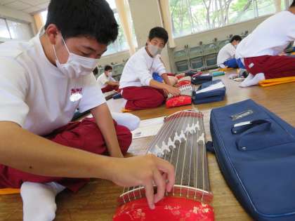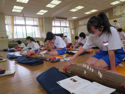 琴で「さくらさくら」伝統的な日本の歌曲を弾いています。できるだけ弦の移動が連続するようにして練習しています。また、メロディーと掛け合うような形にし、それもメロディーを引き立たせるようにして弾いています。最初の授業とは思えないほど琴の音色が音楽室に響いていました。